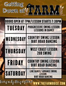 Wednesday– Country Swing- Beginner friendly- Basic into intermediate movement with Dirt Road Dancing